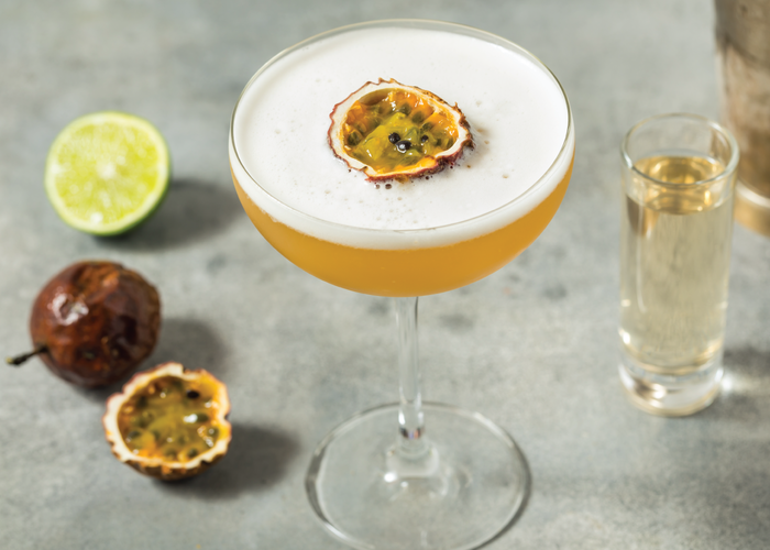 Open the siphon bottle and press the foam on top of the drink to add a luxurious and airy texture. Cut the passion fruit in half, remove the seeds, and add them on top