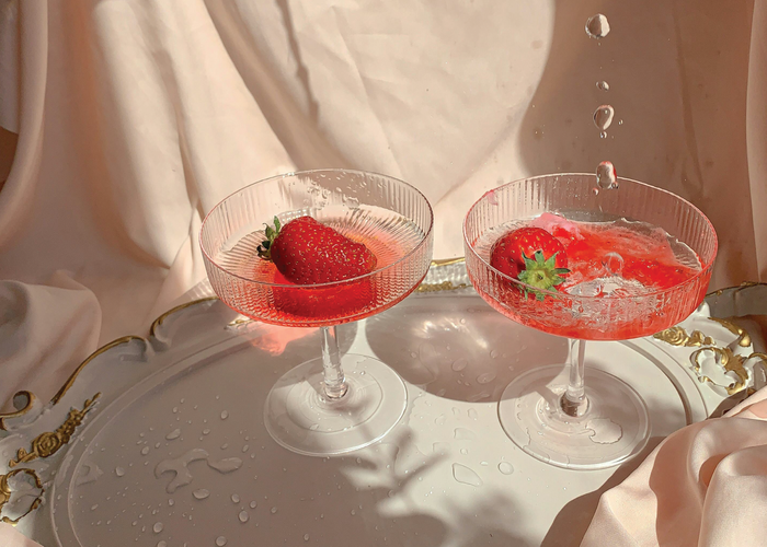 Garnish with sliced strawberries and a sprig of fresh mint.