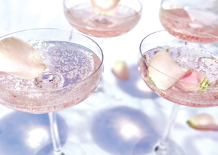 Open the siphon bottle and press the foam onto the drink. Garnish with rose petals.